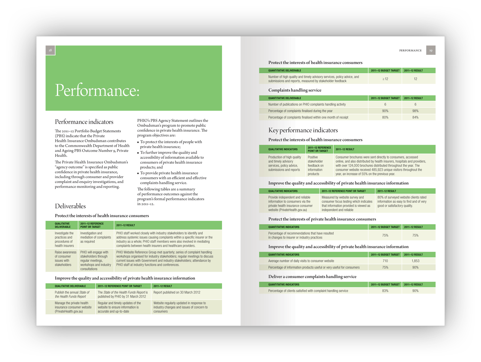 Above (and following): Each double-page spread uses a simple two-by-two grid, upbeat colours, and portraits of consumers experiencing the happy outcome that the Private Health Insurance Ombudsman provided.